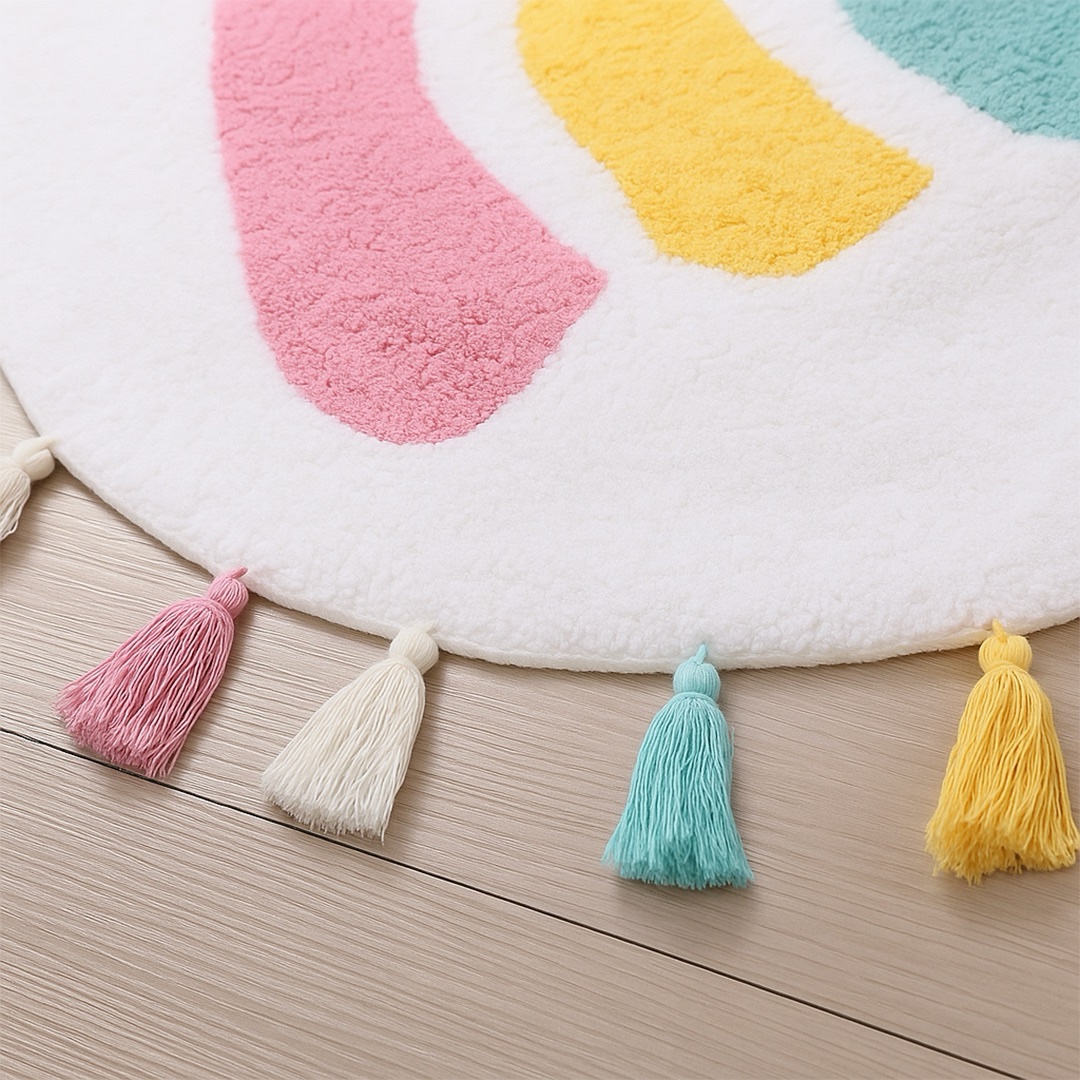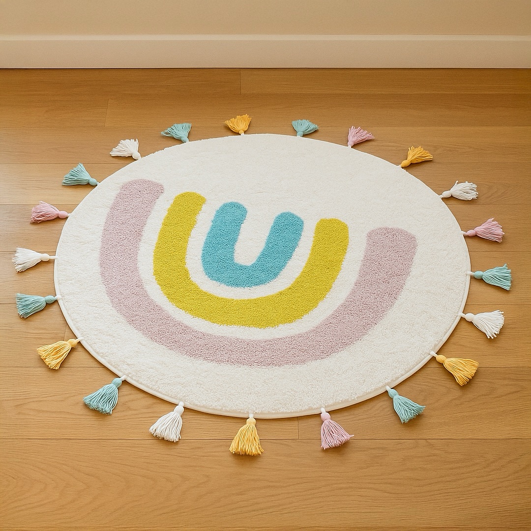 Alfombra circular de 110 cm con diseño de arcoíris. Suave, colorida y fácil de mantener, crea un rincón acogedor para jugar, leer o soñar.
