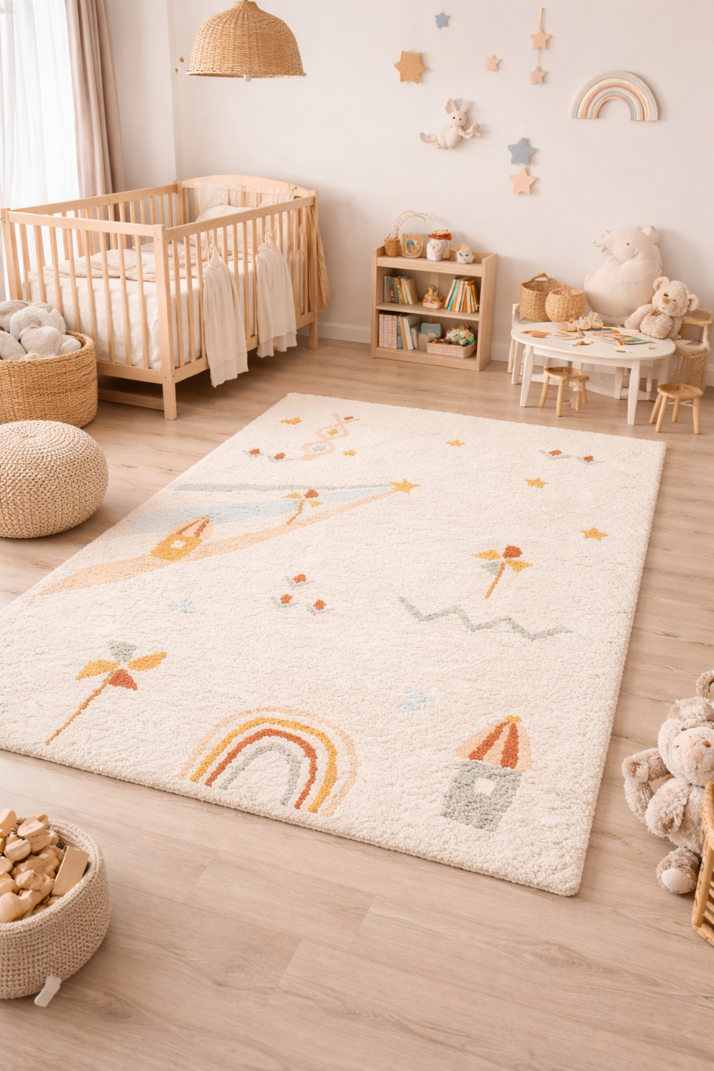 Suaves estrellas y arcoíris se combinan en esta alfombra llena de encanto. Aporta color, calidez y diversión a cualquier habitación infantil.