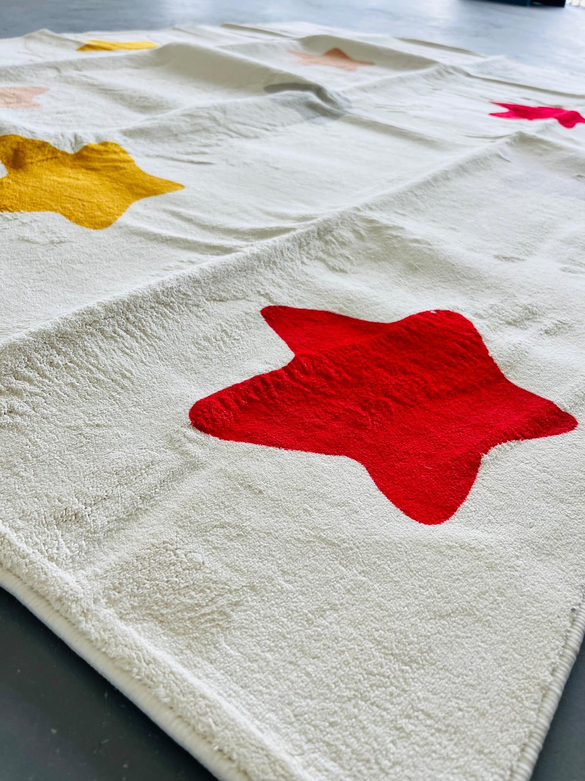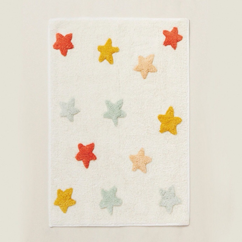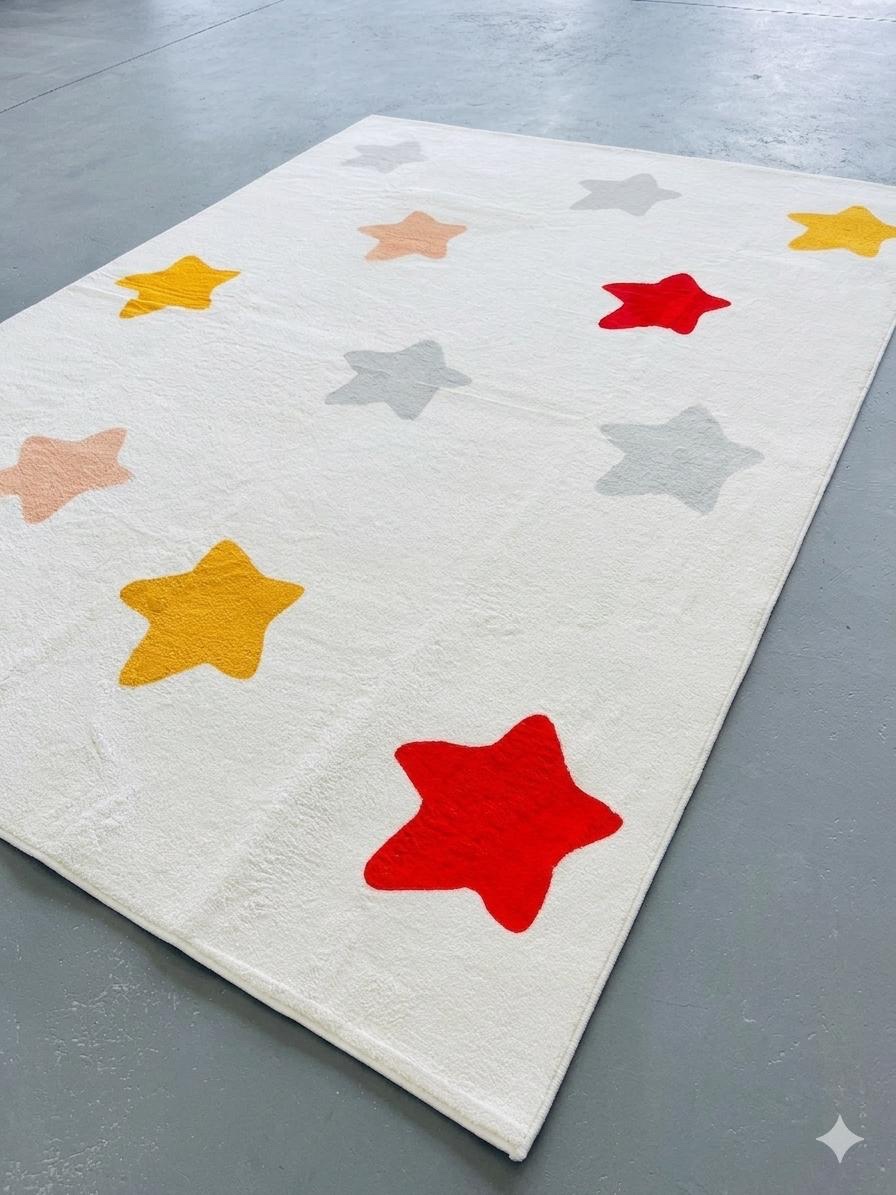 Una alfombra suave y resistente con estrellas multicolor que llena cualquier espacio de alegría y estilo. Perfecta para jugar, leer o relajarse en familia.