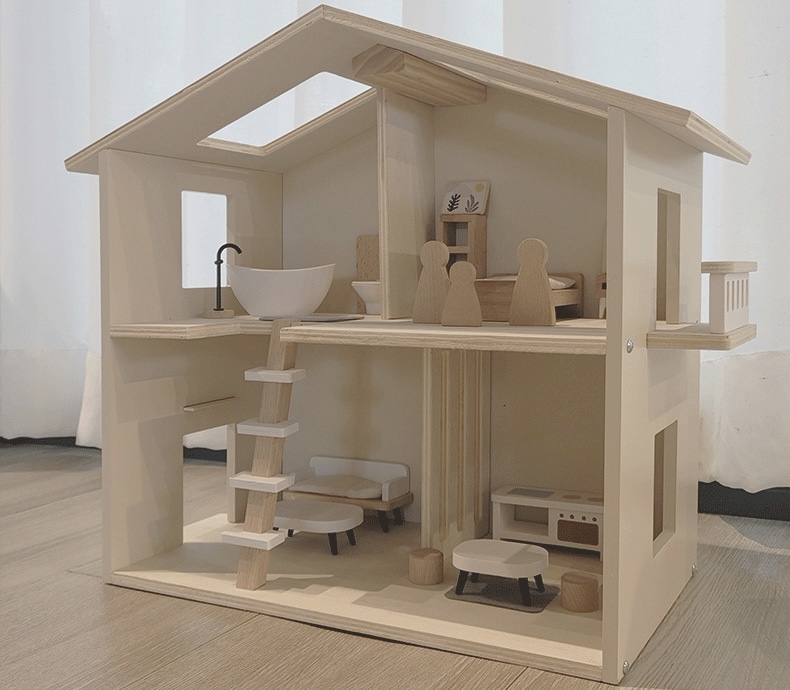 Una encantadora casita de muñecas abierta de dos pisos, hecha en madera natural. Fomenta la creatividad, el juego compartido y la imaginación sin límites.
