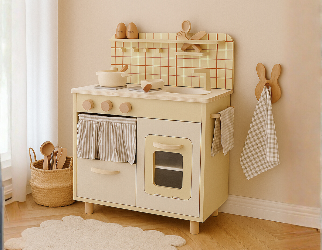 Fabricada en madera resistente, con terminaciones suaves y seguras, invita a los niños a explorar el juego simbólico, la creatividad y la coordinación mientras recrean momentos cotidianos llenos de ternura.