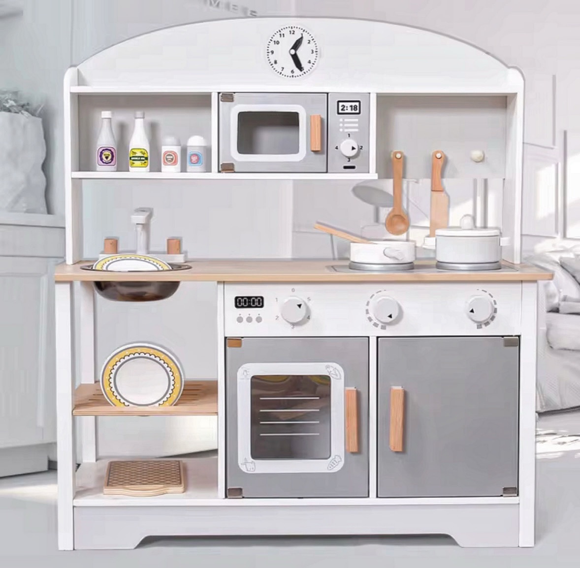 Cocinita de madera blanca y gris con horno, pileta y accesorios. Fomenta la imaginación, la autonomía y el juego compartido, combinando diseño, aprendizaje y diversión.