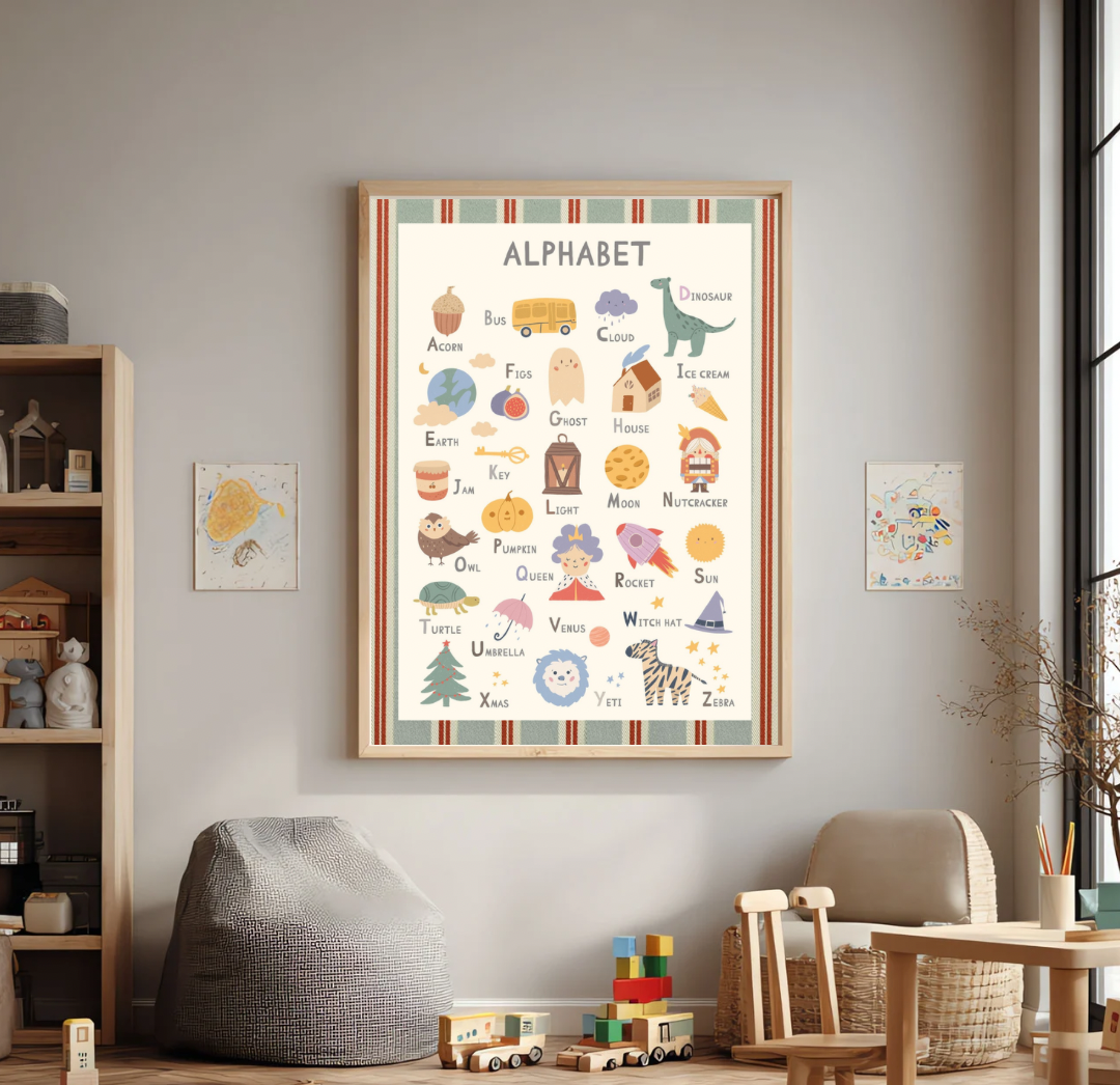 El Cuadro Abecedario Inglés es una excelente opción para combinar educación y decoración en un solo elemento. Cada letra está acompañada de ilustraciones infantiles que ayudan a los niños a reconocer el abecedario en inglés de manera visual, dinámica y entretenida.Es perfecto para dormitorios, áreas de estudio o espacios educativos, fomentando el aprendizaje temprano mientras decora con colores suaves y amigables. Un cuadro pensado para acompañar el crecimiento de los niños y estimular su curiosidad desde pequeños.