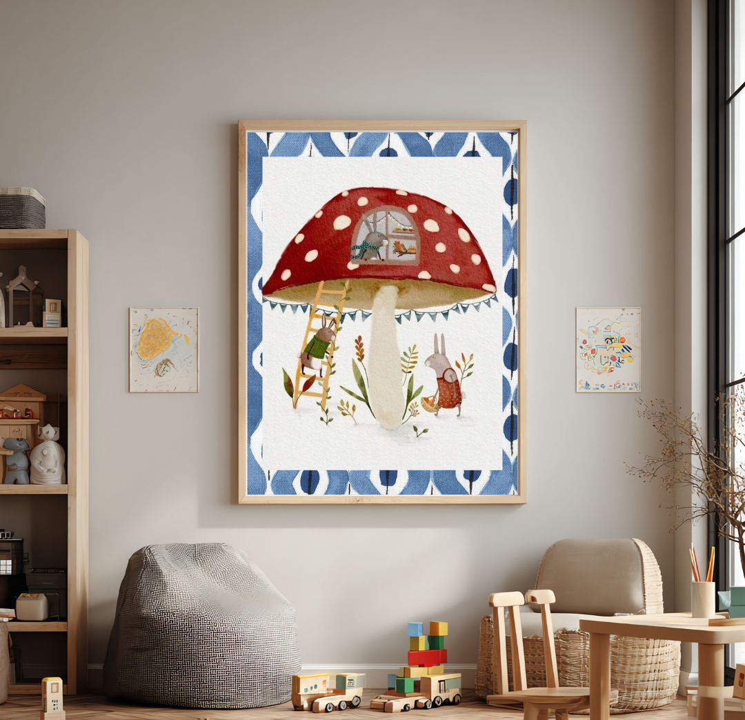 Cuadro infantil de roble, de 40 x 60 cm con una casita de hongo rojo habitada por tres conejitos. Muy resistente y duradero, pensado para acompañar a los chicos por años.