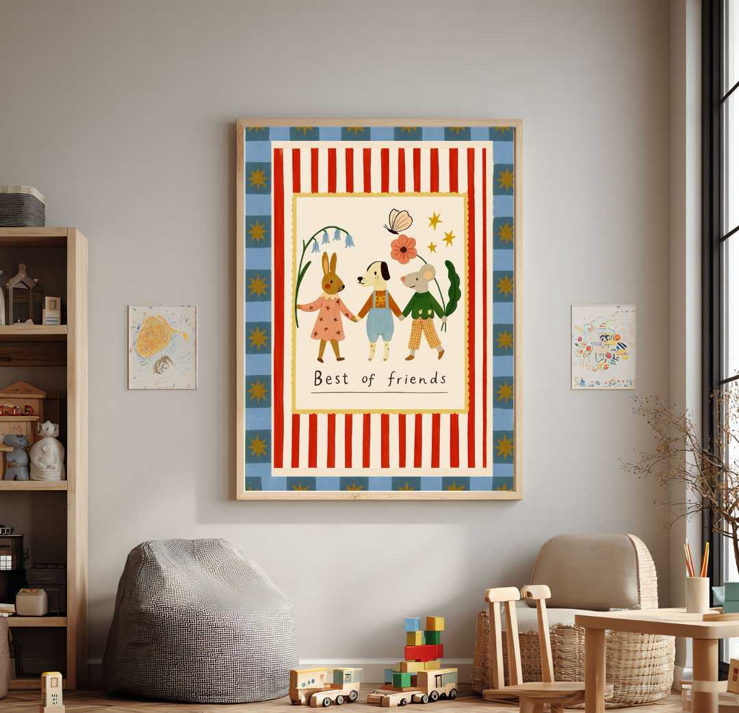 Cuadro infantil de roble claro, de 40 x 60 cm con tres animalitos y la frase “Best of Friends”, que celebra la amistad. Muy resistente y duradero, pensado para acompañar a los chicos por años.