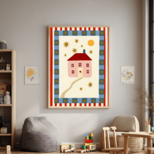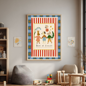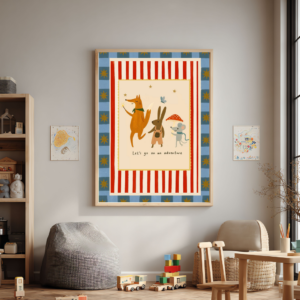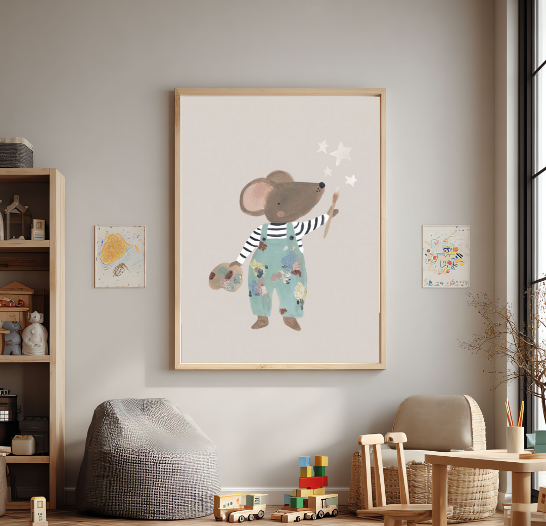 Cuadro infantil de roble, de 40 x 60 cm con un ratoncito pintor, ideal para espacios creativos. Muy duradero y resistente, pensado para acompañar a los chicos por años.