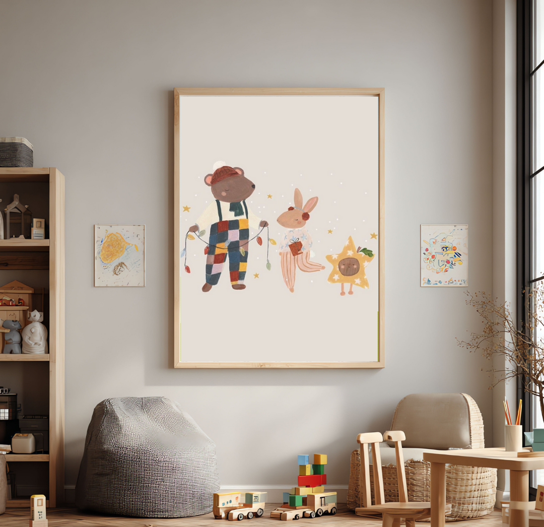 Cuadro infantil de roble, de 40 x 60 cm con dos ratoncitos decorando con guirnaldas, lleno de espíritu festivo y ternura. Muy resistente y duradero, pensado para decorar y acompañar a los chicos por años.