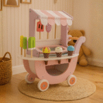 Con colores pasteles suaves y detalles en madera natural, incluye engranajes, laberintos, encastres y piezas móviles que estimulan la coordinación, la motricidad fina y la concentración de manera lúdica.