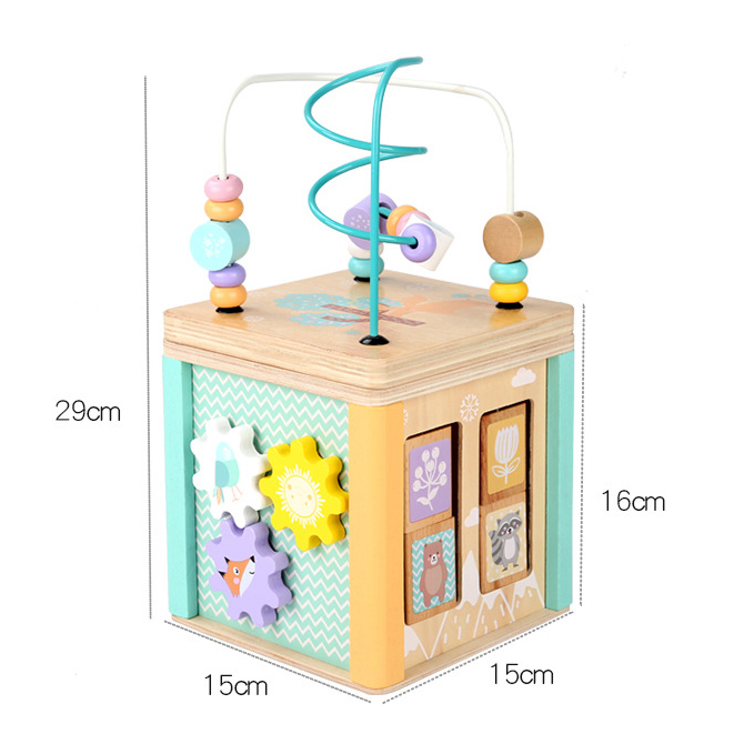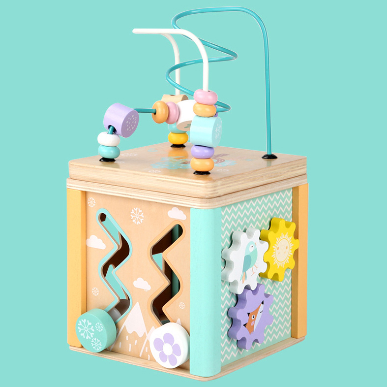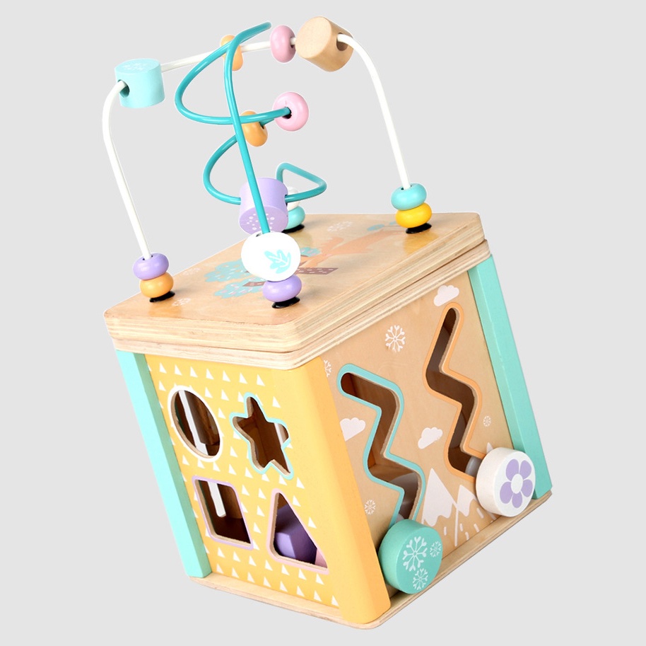 Un cubo de madera con colores pasteles y múltiples actividades sensoriales. Ideal para estimular la motricidad y la curiosidad desde los primeros meses.
