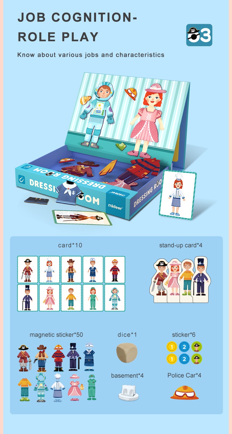Un juego magnético lleno de creatividad y desafíos. Permite vestir y combinar atuendos libremente o seguir reglas en el tablero, estimulando la imaginación, la lógica y la coordinación.