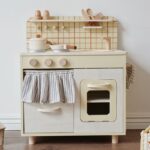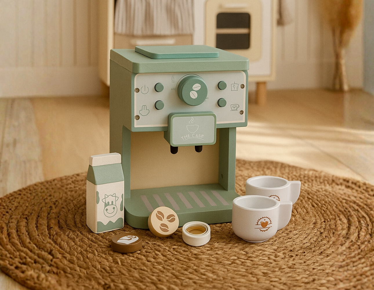 Máquina de café de madera con tazas y cápsulas incluidas. Fomenta la creatividad, la coordinación y el juego simbólico al recrear momentos familiares llenos de imaginación.