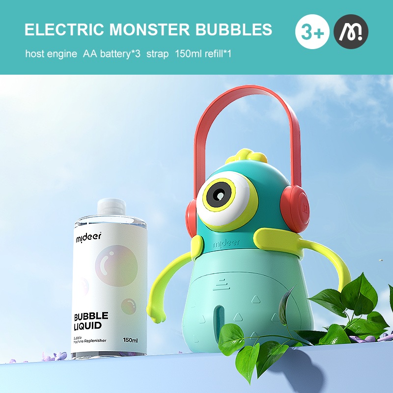 Burbujero musical portátil con diseño de monstruo. Lanza burbujas sin parar e invita a jugar, moverse y reír al aire libre con imaginación y alegría.