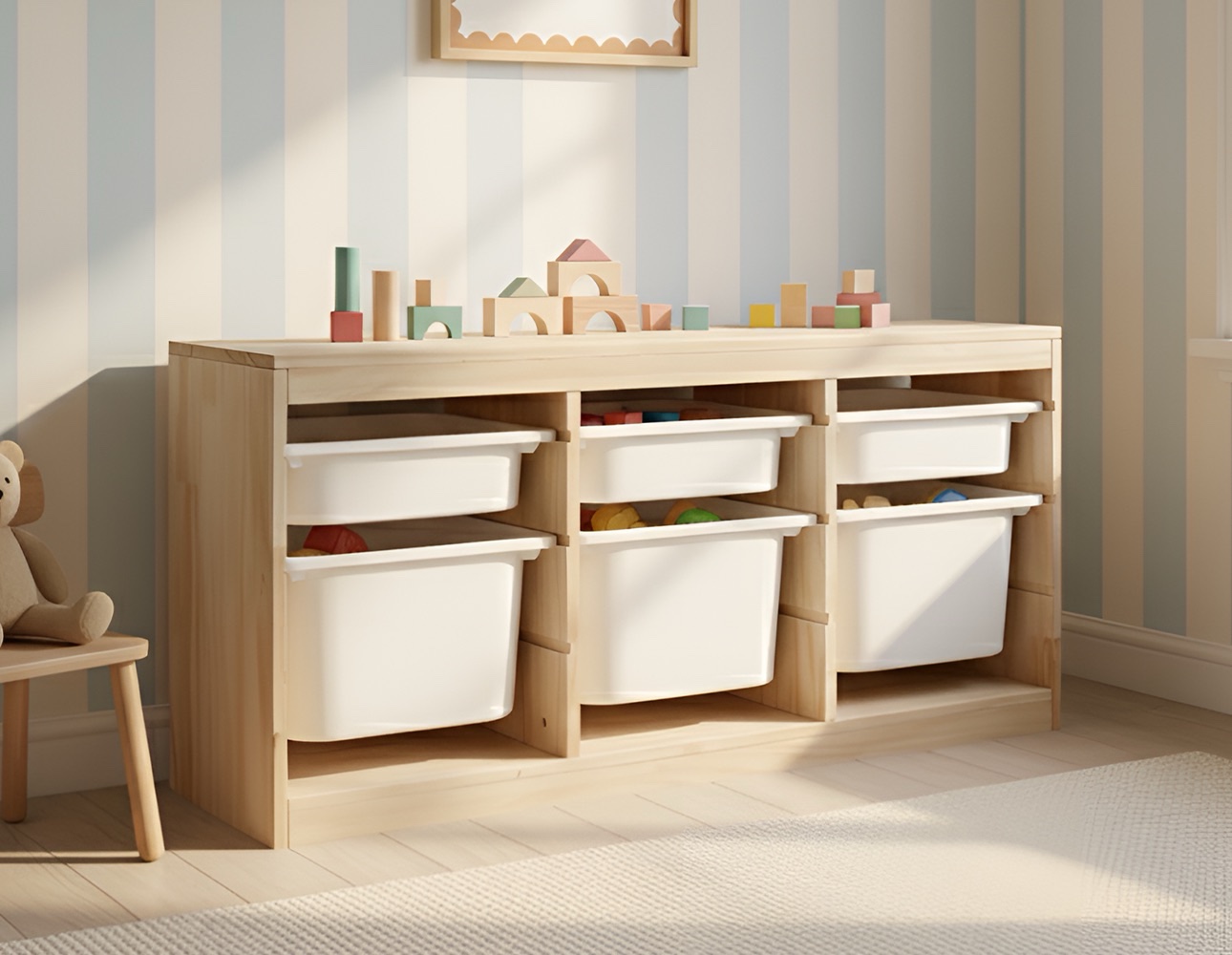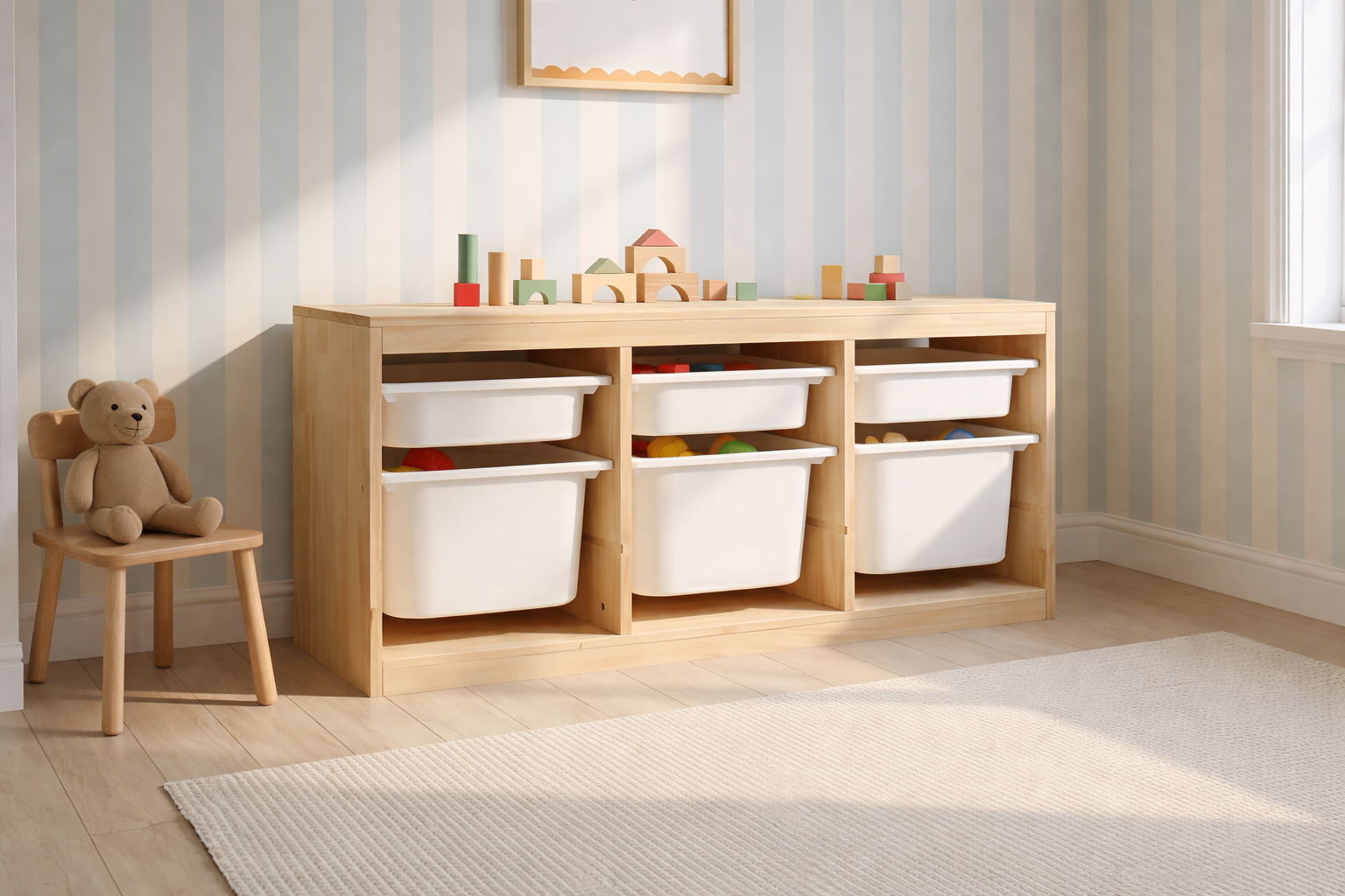 Organizador bajo de madera de pino con cubetas plásticas de dos tamaños. Perfecto para que los niños accedan fácilmente a sus juguetes.