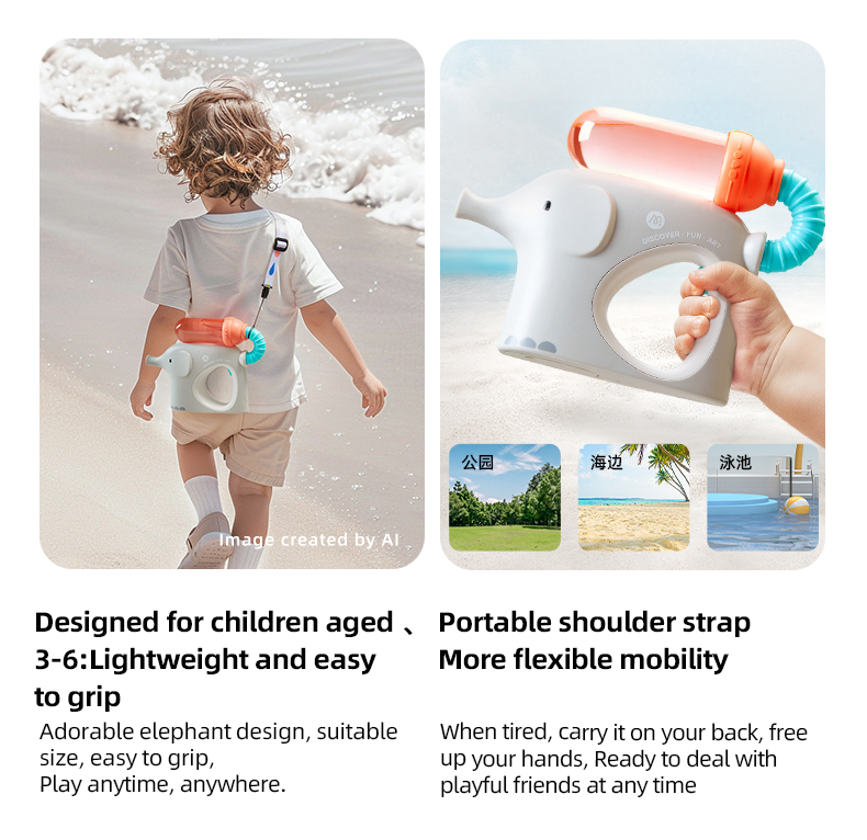 Una pistola de agua con diseño de elefante que transforma cualquier día de verano en pura diversión. Segura, ergonómica y fácil de usar, ¡ideal para jugar al aire libre!