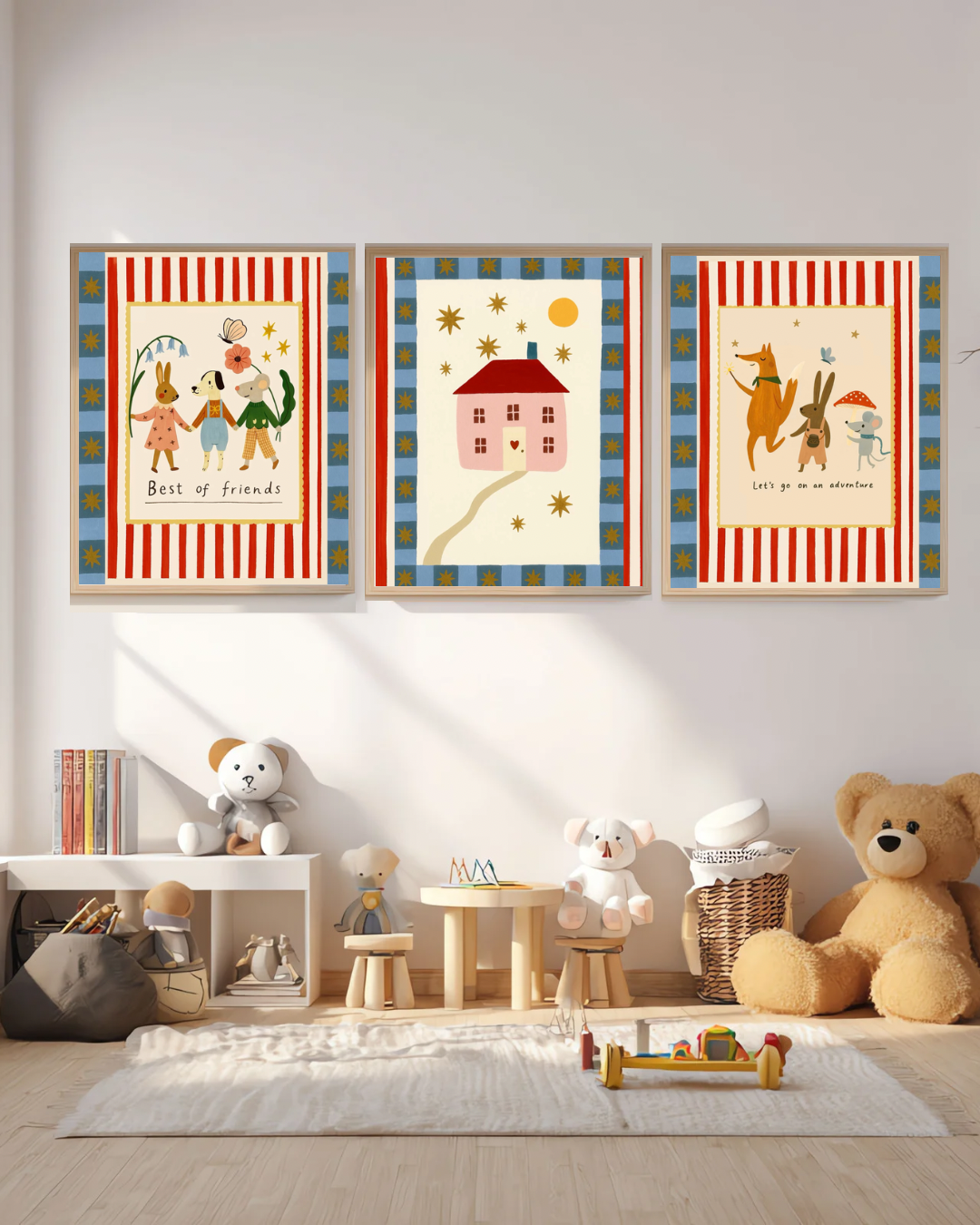 Set de 3 cuadros de roble de 40 x 60 cm cada uno. Un set que combina ternura, amistad y espíritu aventurero, ideal para crear un ambiente equilibrado, inspirador y lleno de imaginación. Muy resistentes y duraderos, pensados para acompañar a los chicos por años.