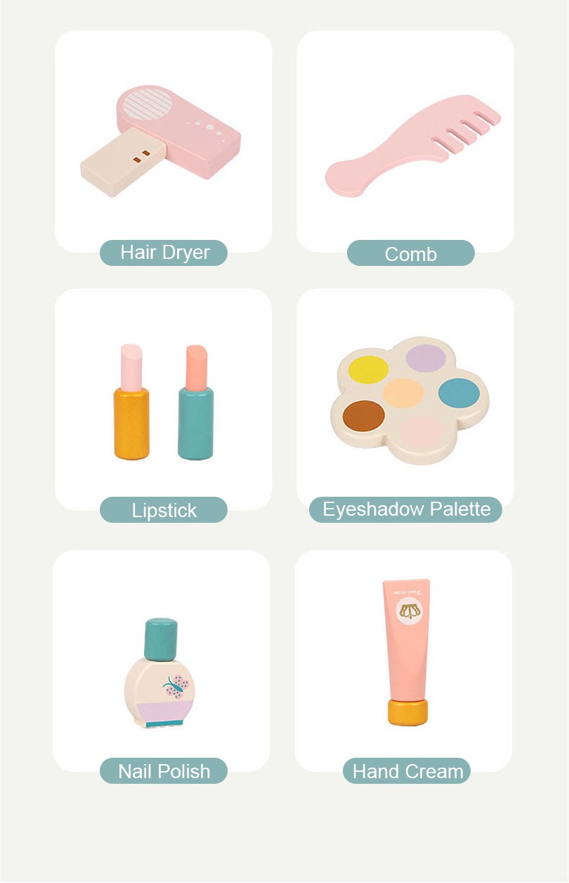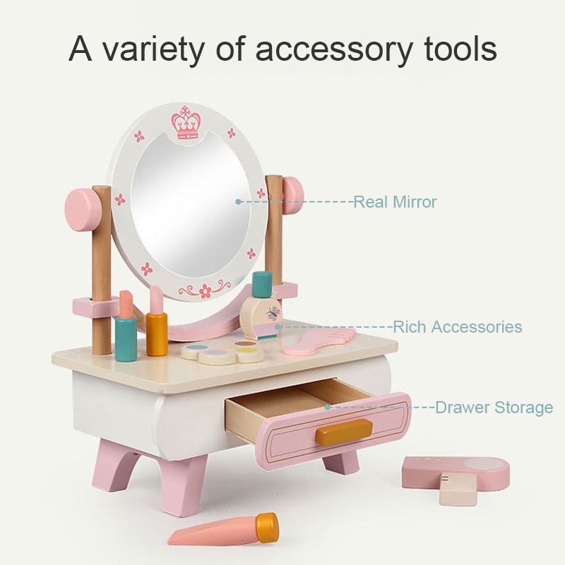 Un encantador tocador de madera con espejo y accesorios. Ideal para jugar, imaginar y descubrir la belleza de crecer con creatividad y ternura.