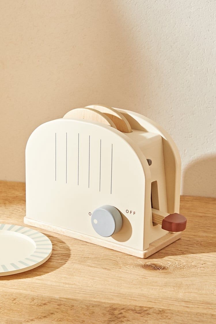 Tostadora de madera con panes y queso de velcro para jugar a preparar desayunos. Fomenta la imaginación, la coordinación y el juego simbólico con ternura y realismo.